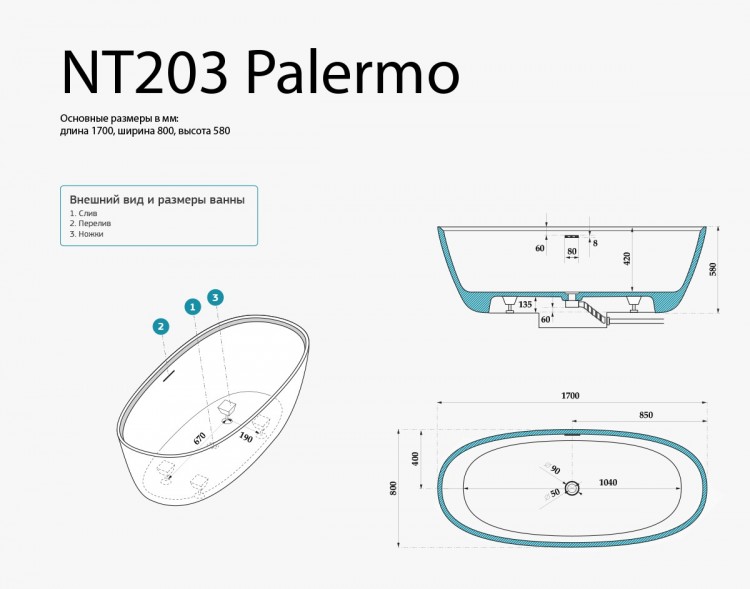 - Ванна из искусственного камня «Палермо» представляет собой правильный эллипс. Совершенство её форм словно переносит нас в тёплые воды солнечной Сицилии.